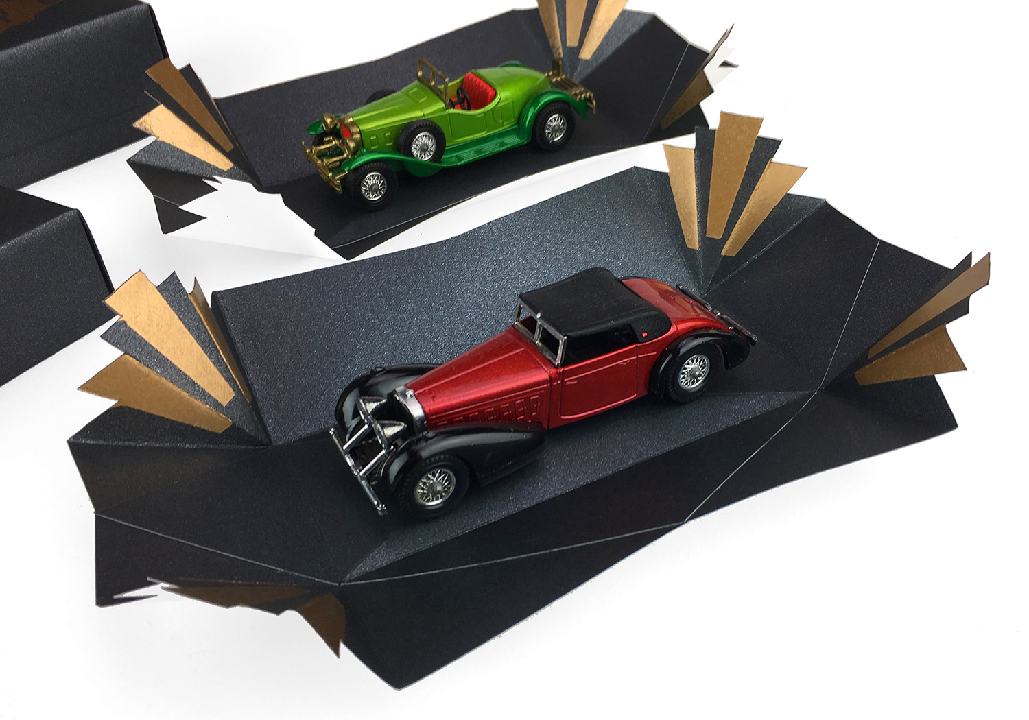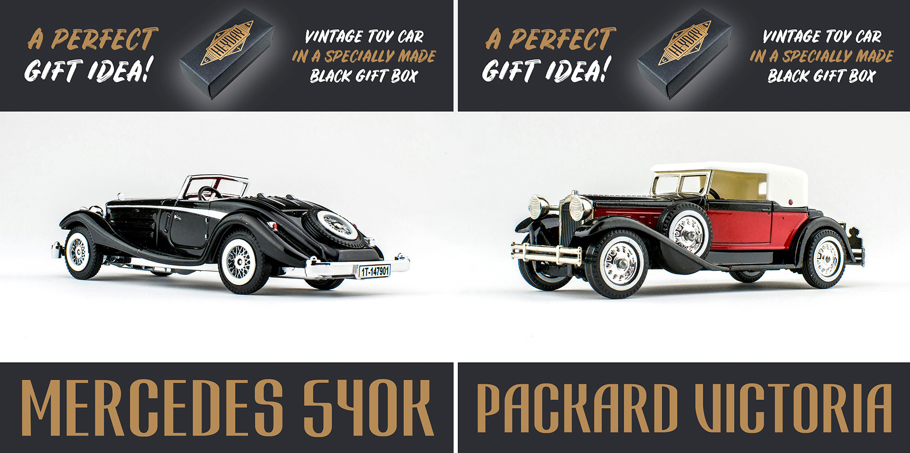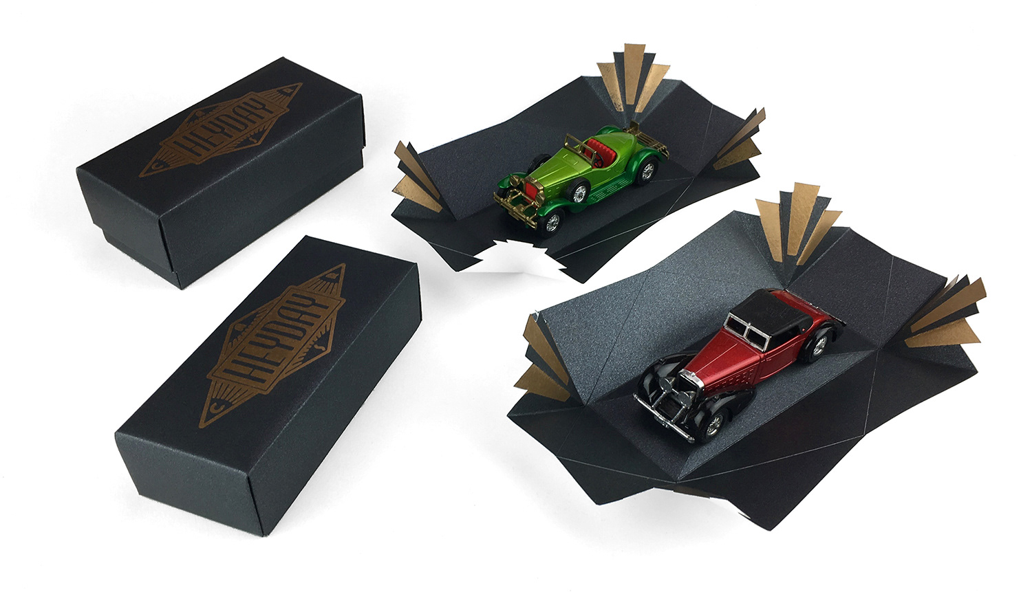 Gift-boxed vintage models of classic cars for Heyday Cars, UK, 2018.